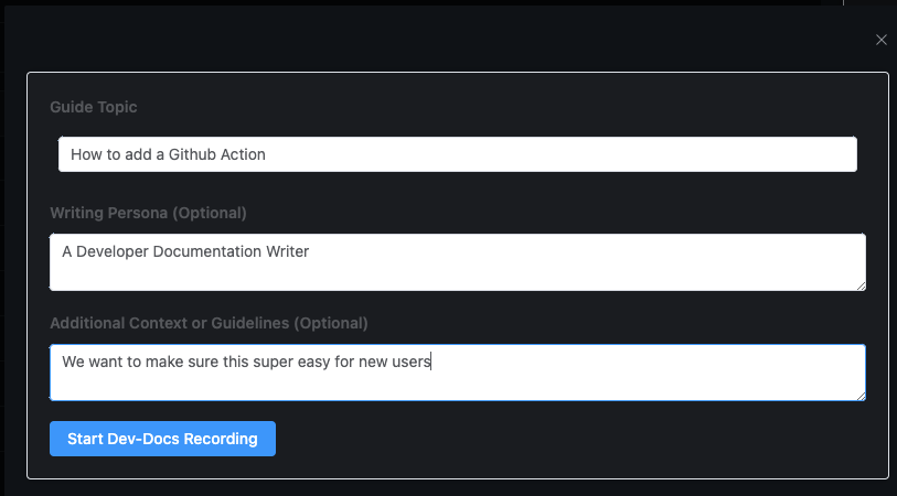 • Additional Context (Optional): Think of this as extra instructions or context to help Dev-Docs write your guide.