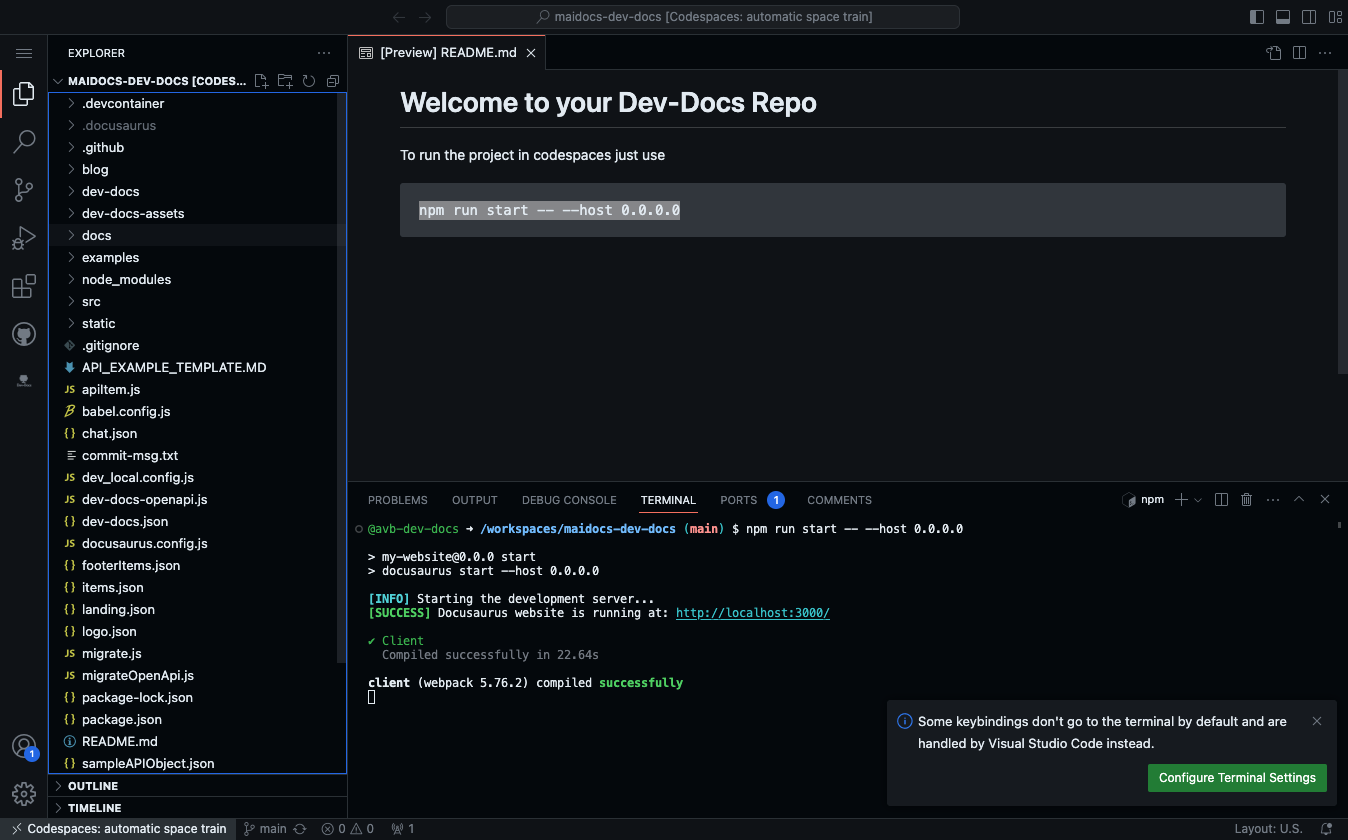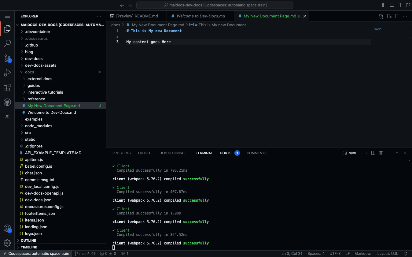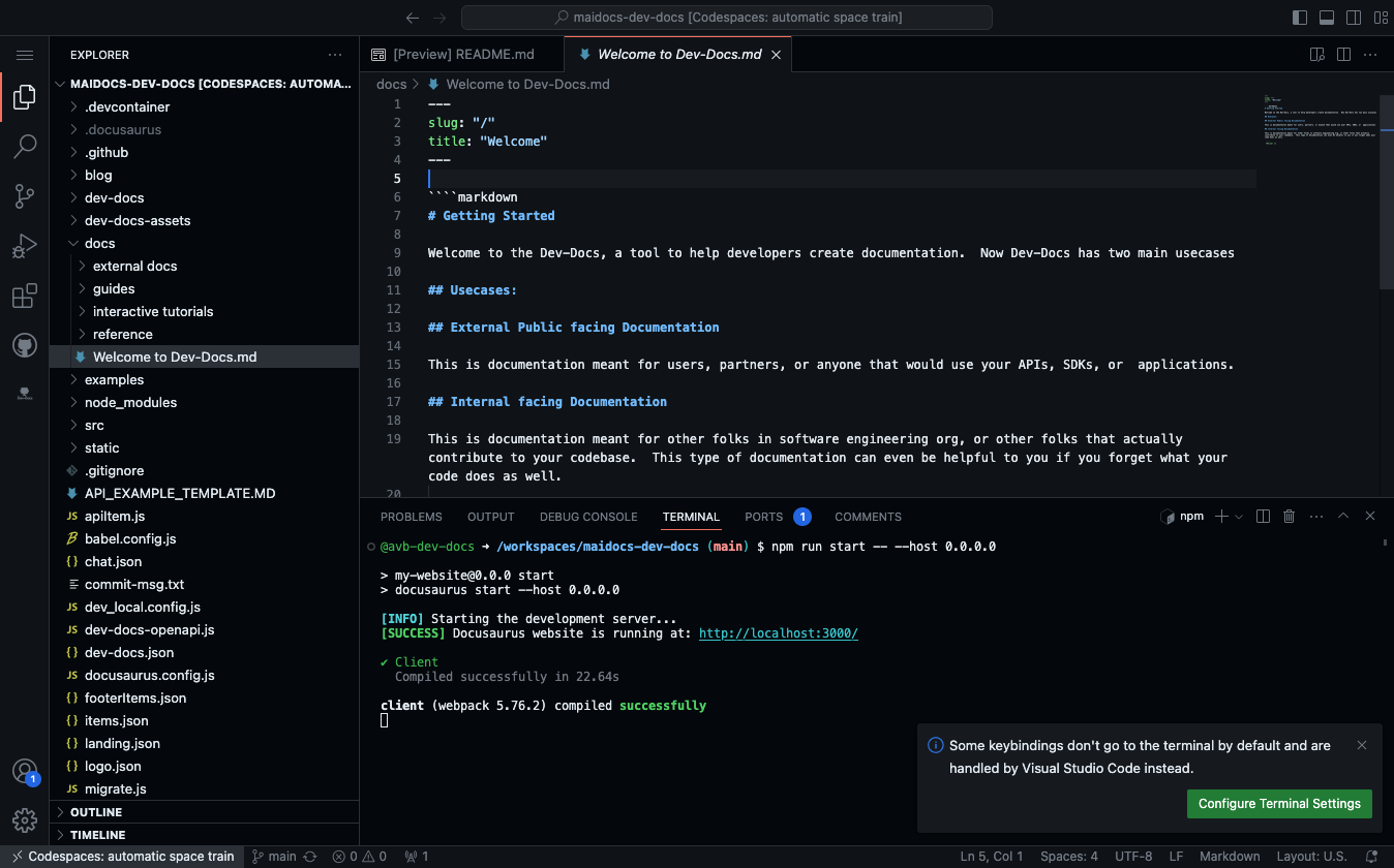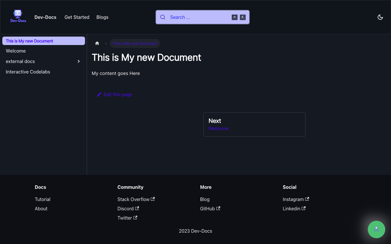 Also a new tab should open that shows your running Dev-Docs repo like below.